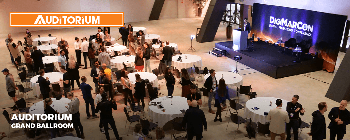 The Auditorium is a live stage with round-table seating of speaker presentations. Presentations feature Keynotes. Industry Panels and Master Classes given by Expert Speakers in the digital marketing industry, providing attendees with digital marketing best practices, latest trends, practical solutions and strategy.